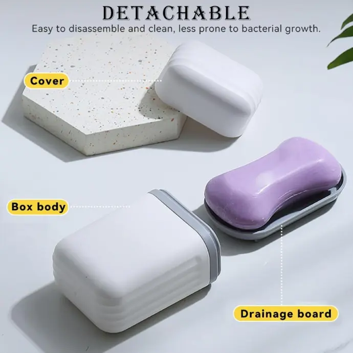 This soap box features a detachable design, including a removable cover, box body, and drainage tray. These components allow for easy disassembly and thorough cleaning.