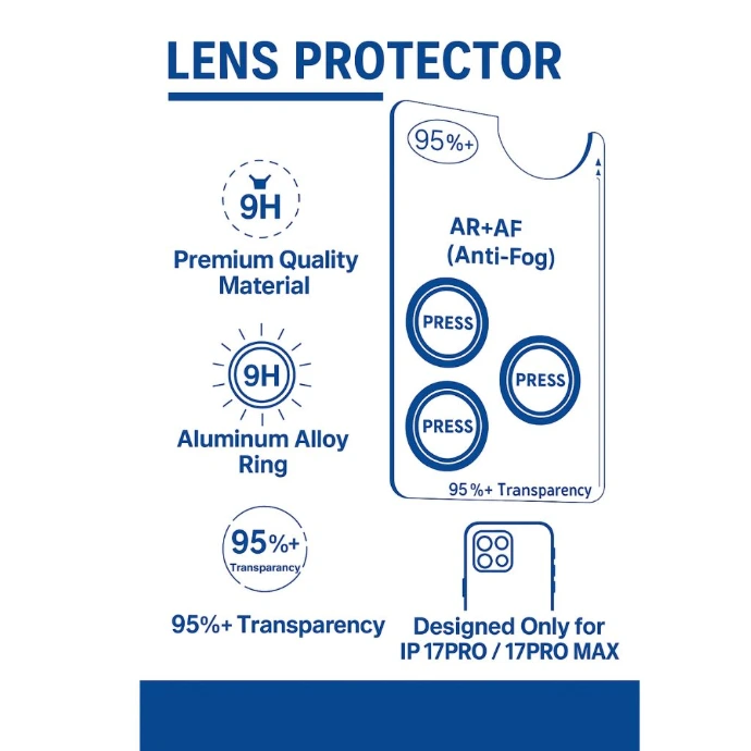 Built with 9H tempered glass and a strong aluminum alloy ring, this lens protector offers 95%+ ultra-clear transparency with advanced AR+AF anti-fog coating. Specially designed to fit iPhone 17 Pro & 17 Pro Max perfectly, ensuring long-lasting durability and crystal-clear photos.