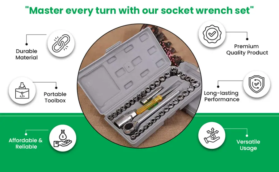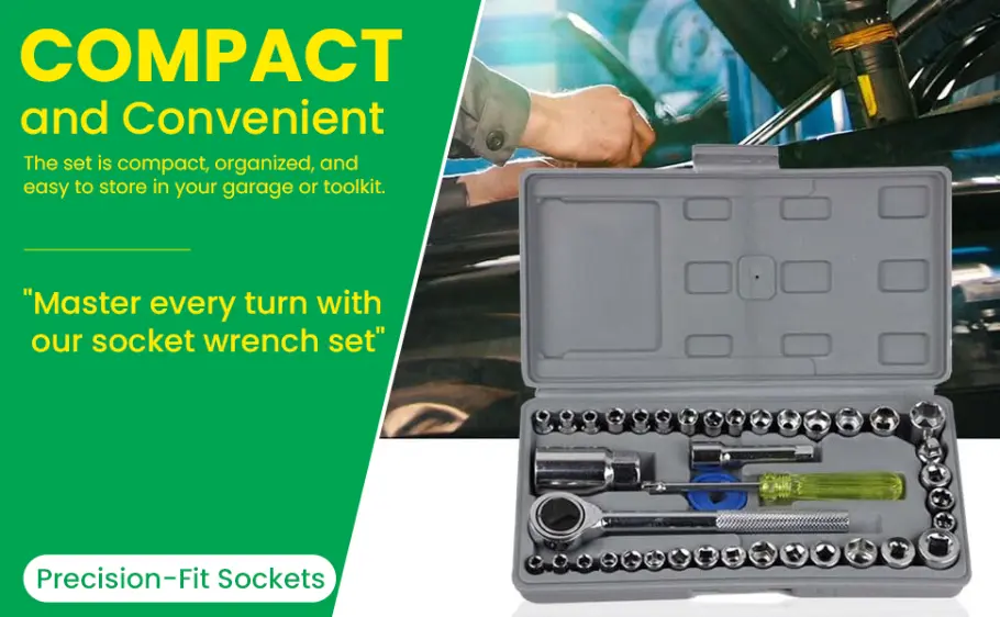4️⃣ Ergonomic & Portable Design:Each tool in this socket wrench set is designed with an ergonomic grip for comfort and precision. Comes with a compact portable toolbox, making it easy to store, carry, and organize your tools — perfect for use at home, garage, or workshop.