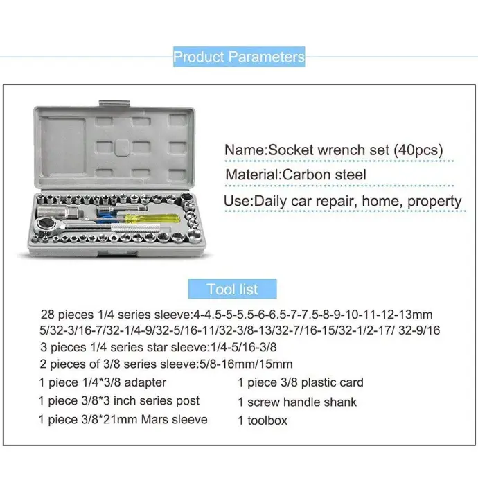 2️⃣ Complete 40-Piece Socket Wrench Set:Includes a wide range of metric and SAE sockets, ratchet handle, extension bar, and adapter — everything you need in one car tool kit set. Ideal for tightening, loosening, or repairing nuts and bolts on cars, motorcycles, bicycles, and home equipment.