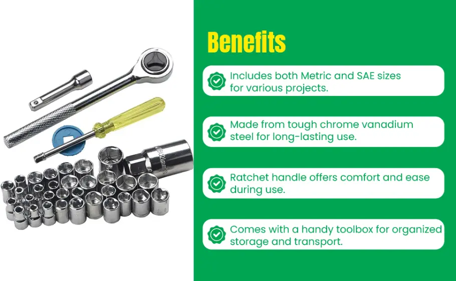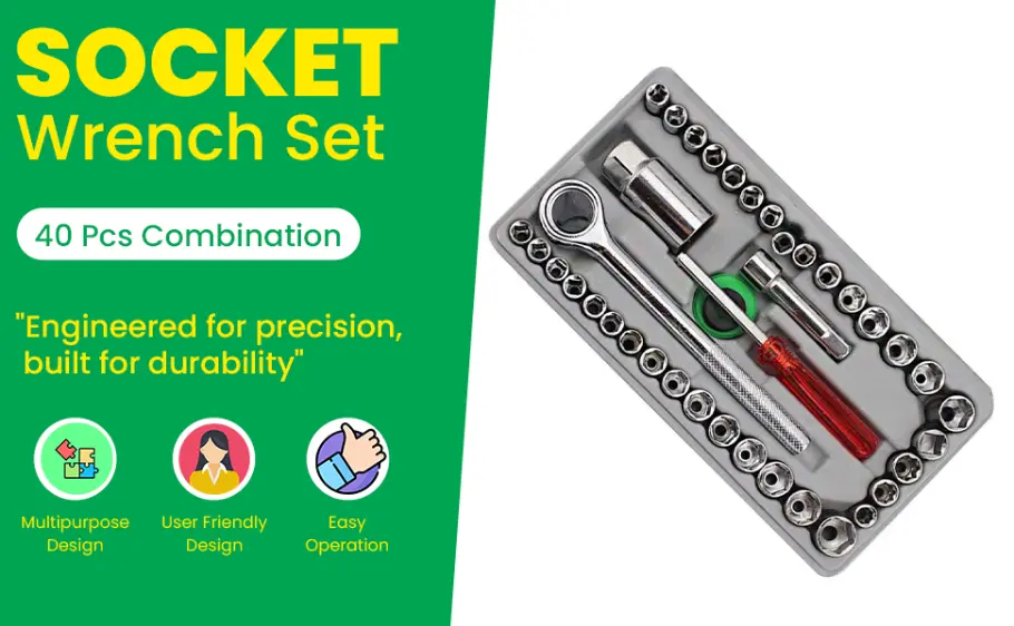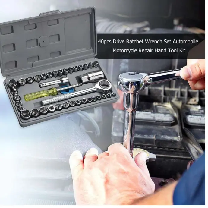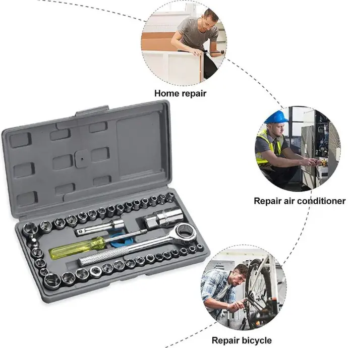 The kit includes 40 high-quality pieces, such as a ratchet handle, extension bars, various metric and SAE socket heads, screwdriver handle, and a compact carrying case. It’s a complete set for car, bike, and home repairs.